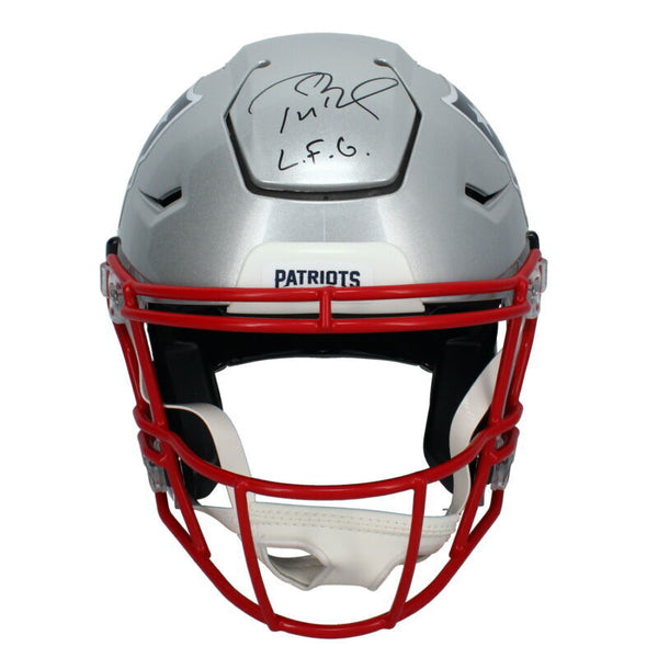 This Patriots authentic speed flex helmet has been personally hand-signed by Tom Brady with the inscriptions "L.F.G." It is officially licensed by the National Football League and comes with an individually numbered, tamper-evident hologram from Fanatics Authentic. To ensure authenticity, the hologram can be reviewed online. This process helps to ensure that the product purchased is authentic and eliminates any possibility of duplication or fraud.This helmet is limited to 25 and you are bidding on a random number from the edition.