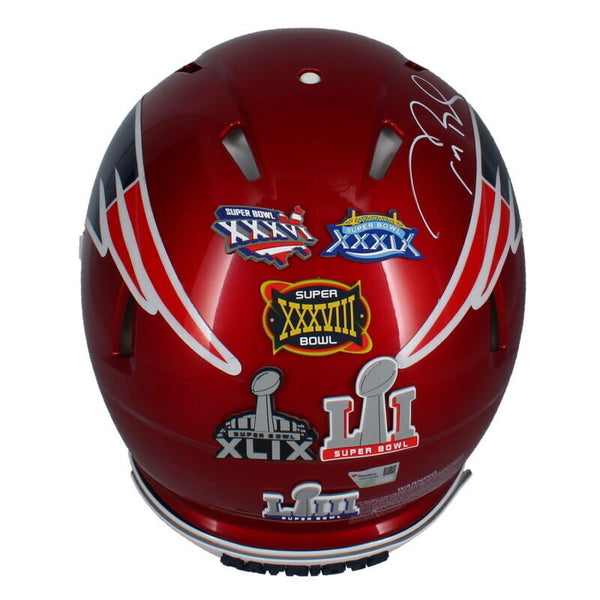 This New England Patriots Flash authentic speed helmet has been personally hand-signed by Tom Brady. It is officially licensed by the National Football League and comes with an individually numbered, tamper-evident hologram from Fanatics Authentic. To ensure authenticity, the hologram can be reviewed online. This process helps to ensure that the product purchased is authentic and eliminates any possibility of duplication or fraud.This helmet comes with a custom visor, 3D bumpers and decals from all six Super Bowls from his time with the New England Patriots. Lets's GO!
