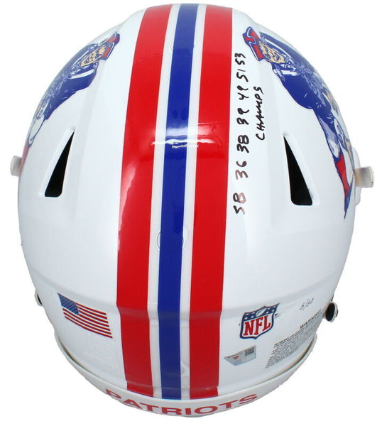 This Patriots throwback authentic speed flex helmet has been personally hand-signed by Tom Brady with the inscriptions "36, 38, 39, 49, 51, 53 Champs". It is officially licensed by the National Football League and comes with an individually numbered, tamper-evident hologram from Fanatics Authentic. To ensure authenticity, the hologram can be reviewed online. This process helps to ensure that the product purchased is authentic and eliminates any possibility of duplication or fraud.This helmet is limited to 50 and you are bidding on a random number from the edition.