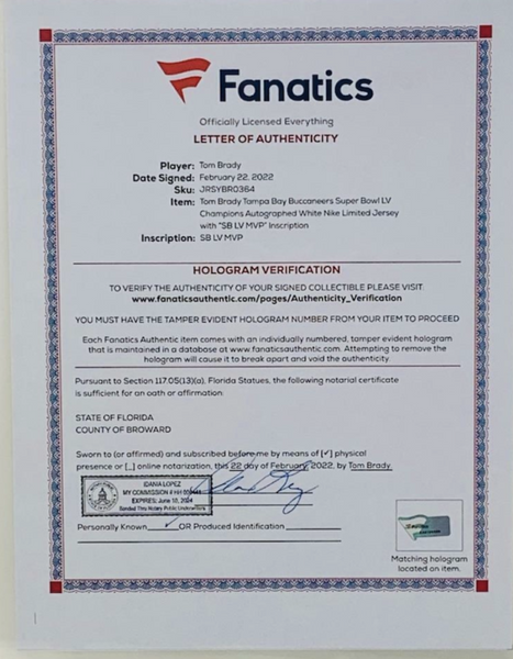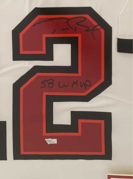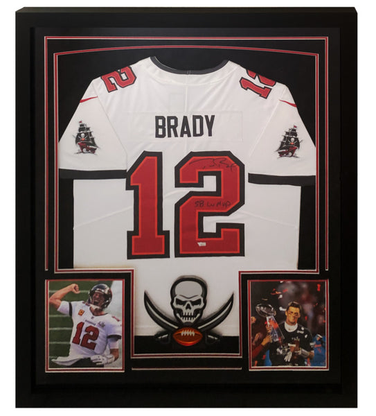 This Nike white Limited jersey has been personally hand-signed by Tom Brady with the inscription "SB LV MVP." It is officially licensed by the National Football League and comes with an individually numbered, tamper-evident hologram from Fanatics Authentic. To ensure authenticity, the hologram can be reviewed online. This process helps to ensure that the product purchased is authentic and eliminates any possibility of duplication or fraud.This autographed and inscribed jersey has been custom framed and measures 42" x 34"
