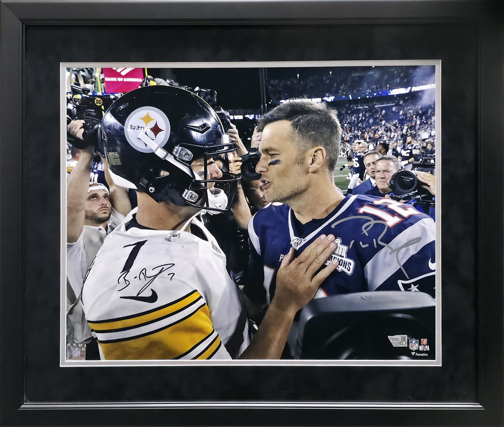 This is a Framed 16x20 Photo, approximately 23x27 with the frame, that has been hand signed by Tom Brady & Ben Roethlisberger. This item has been certified authentic by Upper Deck Authentication (UDA) and comes with their tamper-proof hologram.