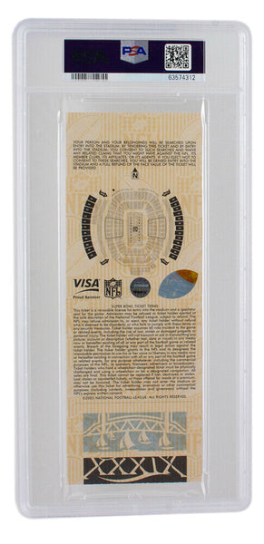 Featured is a Tom Brady signed New England Patriots Super Bowl XXXIX full ticket. This ticket has been hand signed by Brady and has been authenticated and encapsulated by PSA, receiving a condition grade of Near Mint 7 and autograph grade of Gem Mint 10. This ticket would make a great addition to any sports memorabilia collection.. SPECIFICATIONS Autographed By: Team: New England patriots Sport: Football Authentication: Professional Sports Authenticator (PSA)