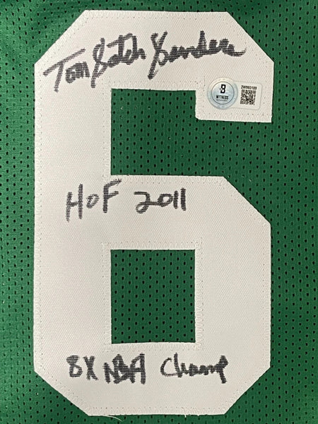 This autographed custom on-court style adult XL jersey has been personally hand-signed by Tom "Satch" Sanders of the Boston Celtics. When signing, Sanders also inscribed "HOF 2011" and "8x NBA Champ" along with his signature.This autograph is certified by James Spence Authentication's (JSA) Witnessed Protection Program. That means that a JSA representative was present when this item was signed. It comes with the numbered hologram and matching Certificate of Authenticity.Custom on-court style jerseys are a more affordable option for autograph seekers. These jerseys do not have any brand name or tags and are made in the Philippines. They feature stitched on names and numbers and are made to look very similar to the on-field jerseys that the players wear. These custom jerseys are very commonly used in the memorabilia industry.
