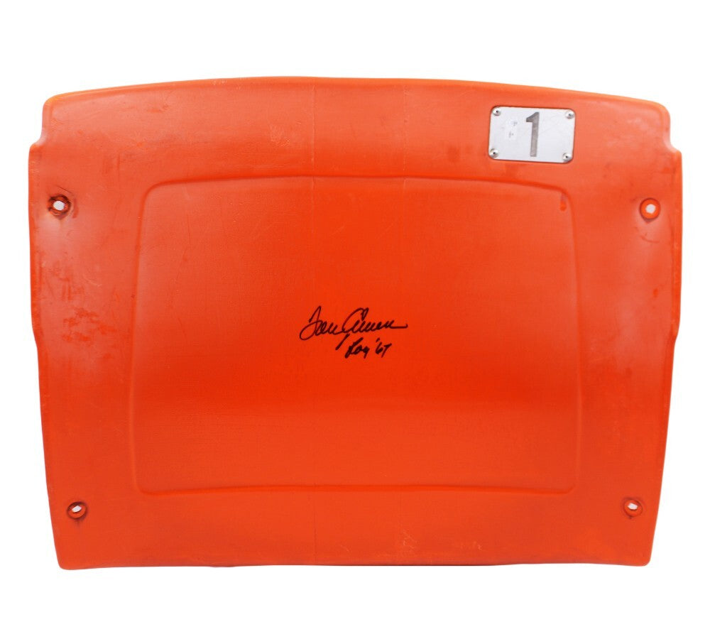 A New York Mets Shea Stadium Orange #1 Seatback hand signed by Tom Seaver. The signature is in excellent condion. The seat back is in used condition. In addition to signing his name, Tom also inscribe "ROY '67" on the item. Tom is a former professional baseball player. He played 20 season as a pitcher in the MLB, inducted into the Baseball Hall of Fame, and is in the Mets and the Reds Hall of Fame. AUTHENTICATION: The item is accompanied by JSA Certificate of Authenticity - JSA Serial Numbered & Databased Hologram.