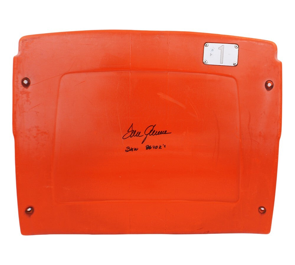 A New York Mets Shea Stadium Orange #1 Seatback hand signed by Tom Seaver. The signature is in excellent condion. The seat back is in used condition. In addition to signing his name, Tom also inscribe "311 W, 3640 K's" on the item. Tom is a former professional baseball player. He played 20 season as a pitcher in the MLB, inducted into the Baseball Hall of Fame, and is in the Mets and the Reds Hall of Fame. AUTHENTICATION: The item is accompanied by JSA Certificate of Authenticity - JSA Serial Numbered & Databased Hologram.