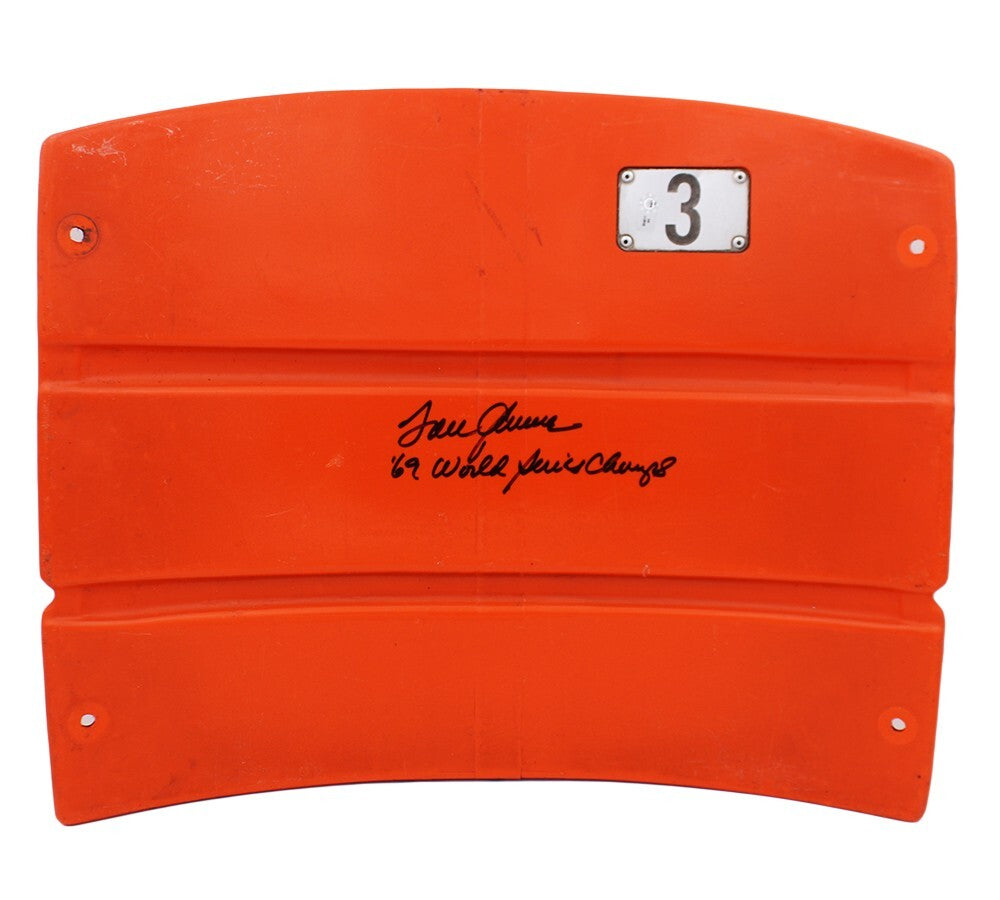 A New York Mets Shea Stadium Orange #3 Seatback hand signed by Tom Seaver. The signature is in excellent condion. The seat back is in used condition. In addition to signing his name, Tom also inscribe "69 World Series Champs" on the item. Tom is a former professional baseball player. He played 20 season as a pitcher in the MLB, inducted into the Baseball Hall of Fame, and is in the Mets and the Reds Hall of Fame. AUTHENTICATION: The item is accompanied by JSA Certificate of Authenticity - JSA Serial Numbered & Databased Hologram.
