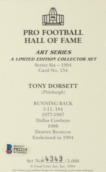Tony Dorsett Autographed Dallas Cowboys Goal Line Art Card - Beckett Auth *Blue This is a hand autographed Goal Line of Tony Dorsett of the Dallas Cowboys. This item has a Beckett Authentication, which comes with a Beckett numbered and a matching Certificate of Authenticity. You can view this item on the Beckett Authentication website. It was signed either at a public autograph appearance or a private signing. This is a stock photo of the item. Although you may not receive this exact item, the item you receive is virtually identical and brand new in great shape.