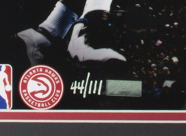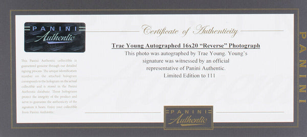 Featured is a Trae Young signed framed limited edition x/111, 16x20 Atlanta Hawks NBA photo. This photo was hand signed by Trae Young and comes with the Panini Authentic hologram and COA card. This photo is professionally framed featuring double matting and an engraved nameplate. The frame measures approximately 20x24 in total size, and it is ready for display. This item would make a great addition to any sports memorabilia collection.. SPECIFICATIONS Autographed By: Trae Young Team: Atlanta Hawks Sport: Basketball-NBA Authentication: Panini Authentic
