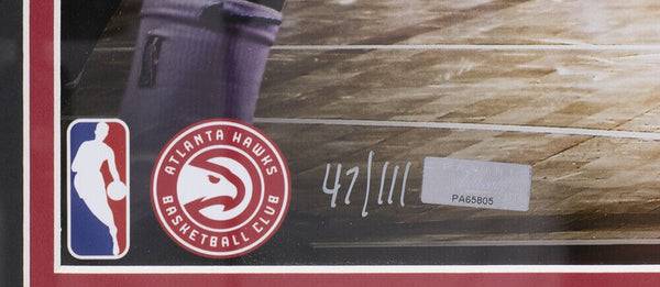 Featured is a Trae Young signed framed Atlanta Hawks limited edition x/111, 16x20 NBA photo. This photo was hand signed by Trae Young and comes with the Panini Authentic hologram and COA card. This photo is professionally framed featuring double matting and an engraved nameplate. The frame measures approximately 20x24 in total size, and it is ready for display. This item would make a great addition to any sports memorabilia collection. SPECIFICATIONS Autographed By: Trae Young Team: Atlanta Hawks Sport: Basketball Authentication: Panini Authentic