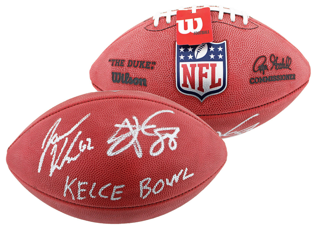 This Autographed Official Wilson 2020 "The Duke" Nfl Football with the inscription of "Kelce Bowl (Jason)" has been Personally Signed by Travis Kelce & Jason Kelce. This item is 100% Authentic to include a hologram by Beckett Authentication Services. This item will come with an affixed Beckett Authentication Services (BAS) authentication sticker, which includes a scannable QR code to verify authenticity. Please note that Beckett no longer provides serial-numbered COA cards, and the attached BAS sticker will serve as the complete authentication for this item. We conducted an autograph signing with Travis Kelce & Jason Kelce where multiples of the same item were signed. While the photographs are representative of this item, the size, placement and strength of the signature may vary. Each item is hand signed, therefore, each autograph is unique. This item can be verified through BAS. The Jason Kelce signature was witnessed by PSA/DNA and has its own authentication hologram.
