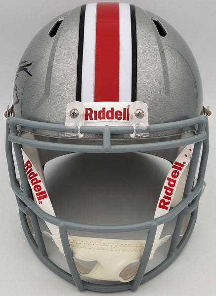 This is an Ohio State Buckeyes Silver Full Size Replica Speed Helmet that has been hand signed by TreVeyon Henderson. This item has been certified authentic by Beckett Authentication (BAS) and comes with their tamper-proof QR Code sticker that can be verified on the Beckett-authentication.com.