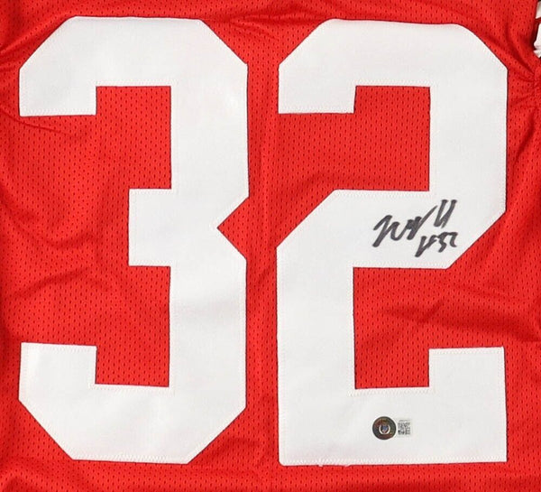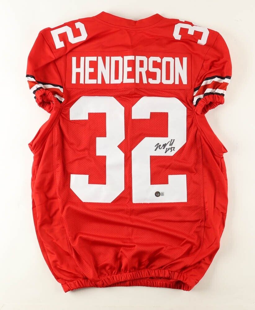 Custom on-field style jersey. Everything is sewn on, size XL. Hand-signed by TreVeyon Henderson.The lot / autograph(s) includes an official Beckett Authentication Services serially-numbered hologram for authenticity purposes.Authentication: Beckett Hologram