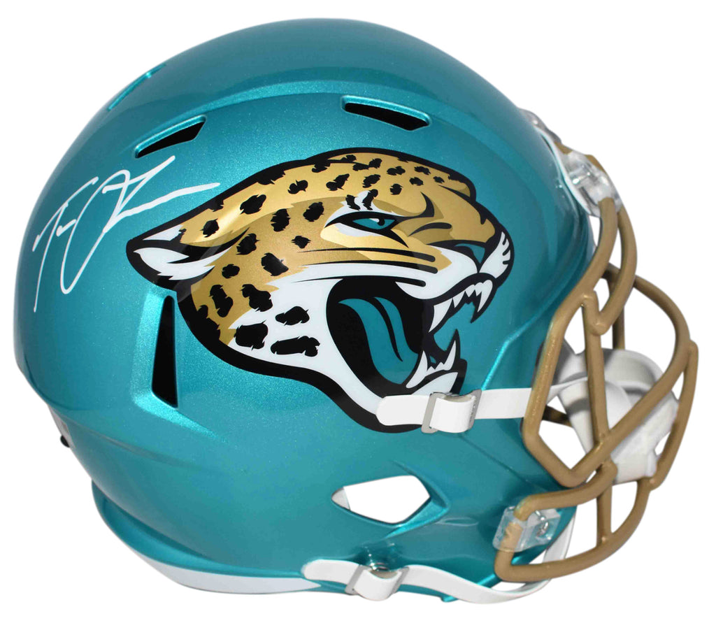 Trevor Lawrence, star quarterback for the Jacksonville Jaguars, has hand signed this Jaguars Riddell Speed Flash full-size replica helmet at a private signing. This item comes with a serial-numbered hologram from Fanatics Authentic, one of the leaders in the industry. The authenticity can be verified online by entering the serial-number. A Fanatics Authentic information card is also included.Item pictured may not be the exact item you will receive. It will be similar quality, and we guarantee your satisfaction.