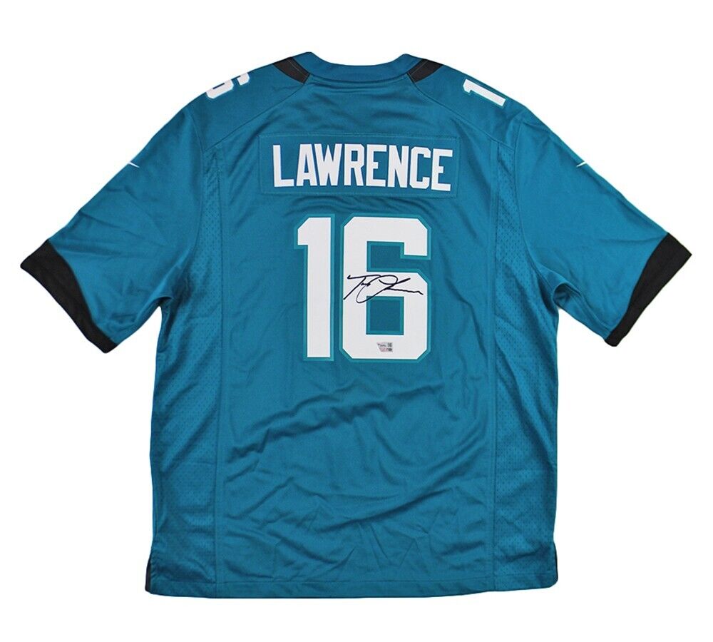 A Jacksonville Jaguars Nike Game Teal NFL Jersey hand signed by Trevor Lawrence. The item and signature are in excellent condition. Trevor was drafted into the NFL in 2021. He is CFP National champion, a CFP National Championship Offensive MVP (2018) and a First-team All-American (2020). AUTHENTICATION: The item is accompanied by a Fanatics Serial Numbered and Databased Hologram