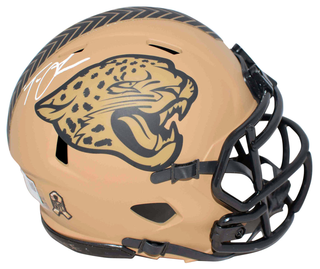 Trevor Lawrence, star quarterback for the Jacksonville Jaguars, has hand signed this Jaguars Riddell Speed Salute to Service II mini helmet at a private signing. This item comes with a serial-numbered hologram from Fanatics Authentic, one of the leaders in the industry. The authenticity can be verified online by entering the serial-number. A Fanatics Authentic information card is also included.Item pictured may not be the exact item you will receive. It will be similar quality, and we guarantee your satisfaction.