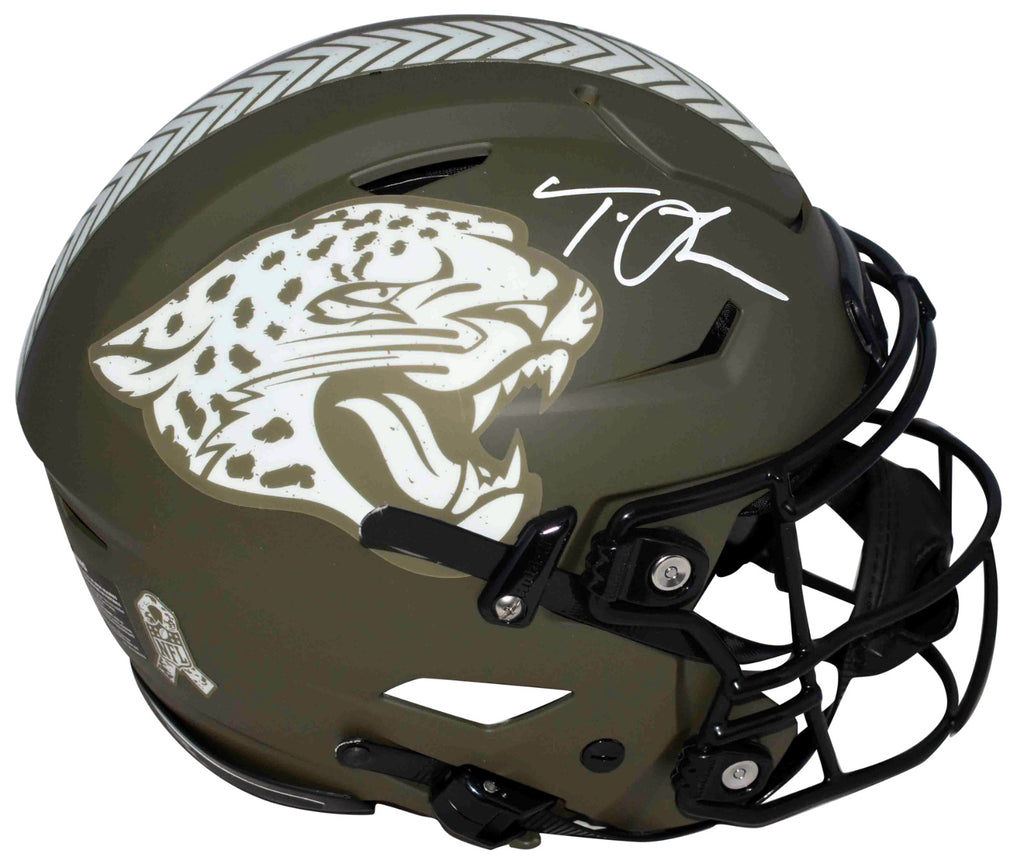 Trevor Lawrence, star quarterback for the Jacksonville Jaguars, has hand signed this Jaguars Riddell SpeedFlex Salute to Service II full-size authentic helmet at a private signing. This helmet is fully padded inside like the ones worn on the field. This item comes with a serial-numbered hologram from Fanatics Authentic, one of the leaders in the industry. The authenticity can be verified online by entering the serial-number. A Fanatics Authentic information card is also included.Item pictured may not be the exact item you will receive. It will be similar quality, and we guarantee your satisfaction.