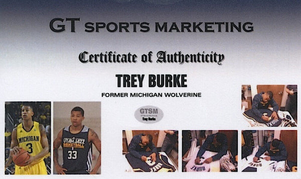 Custom on-court style jersey. Everything is sewn on, size XL. Hand-signed in black felt-tip pen by Trey Burke. The lot / autograph(s) includes an official Trey Burke player hologram and matching COA from GT Sports Marketing for authenticity purposes. Authentication: GTSM COA & Burke Hologram