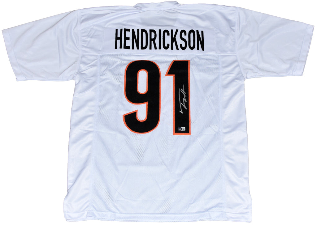 Trey Hendrickson, All-Pro defensive end for the Cincinnati Bengals, has hand signed this white custom jersey at a private signing. Jersey is size XL and all letters/numbers are sewn-on. This item is authenticated by Beckett Authentication Services and was signed in the presence of one of their representatives. Their tamper-evident hologram featuring a QR code and serial number is on the item. The authenticity can be verified online by entering the serial number or scanning the QR code.Item pictured may not be the exact item you will receive. It will be similar quality, and we guarantee your satisfaction.