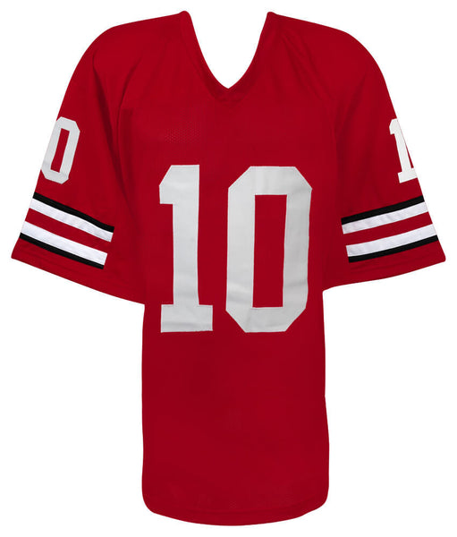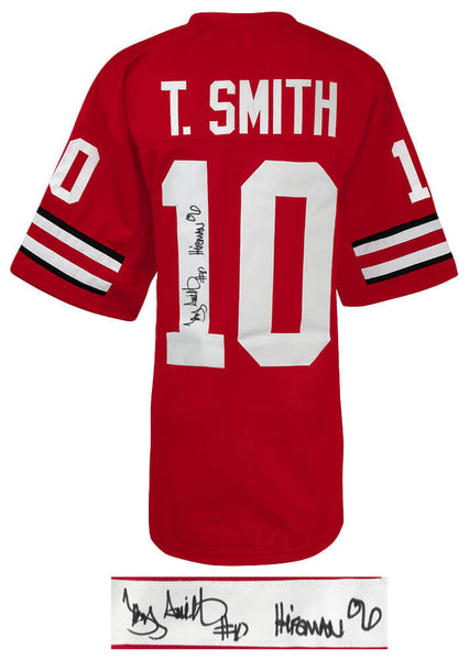 Troy Smith signed red custom college football jersey with 'Heisman 06' inscription. Item comes with a Schwartz Sports Memorabilia tamper-proof numbered hologram and Certificate of Authenticity which can be verified online.