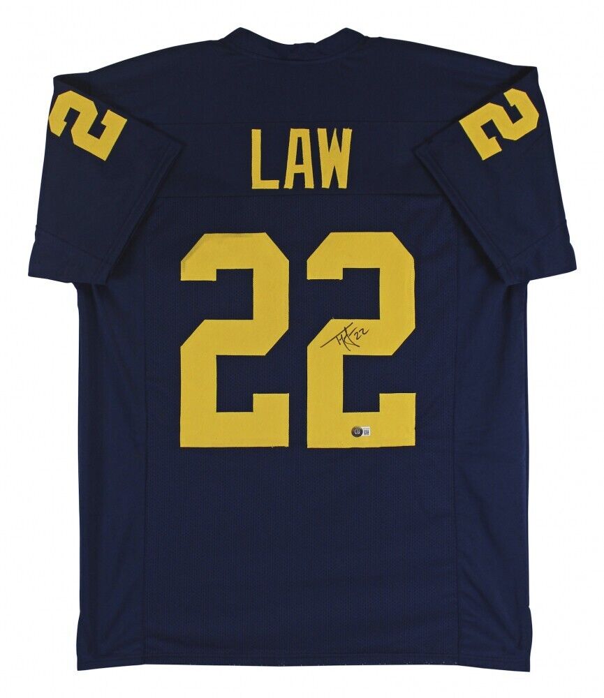 Custom on-field style jersey. Everything sewn on, size XL. Hand-signed in black felt-tip pen by Ty Law (HOF). The lot / autograph(s) includes an official Beckett Authentication Services serially numbered hologram and QR Code card for authenticity purposes. The signing of this item was witnessed by Beckett.Authentication: Beckett QR Code Card