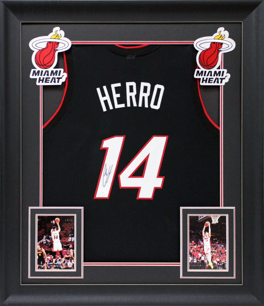 This Autographed Black Pro Style Framed Jersey has been Personally Signed by Tyler Herro of the Miami Heat . This item is 100% Authentic to include a Certificate of Authenticity (COA) / hologram by JSA. We conducted an autograph signing with Tyler Herro where multiples of the same item were signed. While the photographs are representative of this item, the size, placement and strength of the signature may vary. Each item is hand signed, therefore, each autograph is unique. This item can be verified through JSA. This item has been professionally framed to overall dimensions of approximately 32 x 37 inches. This is a X-Large sized, non-branded, custom-stitched Framed Jersey. This jersey will be framed to order, it will take 3-4 days from purchase date for it to ship.