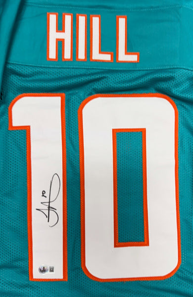 Custom Replica jersey hand signed by Miami Dolphins Wide Receiver TYREEK HILL. The signature is in Black Sharpie. This jersey was signed at a private signing with us and would make a great addition to any DOLPHINS collection! The jersey size is XL and all letters and numbers are sewn in. This item is guaranteed to be 100% authentic and will include a COA hologram from Beckett authentication.