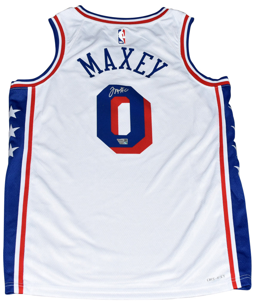 Tyrese Maxey, All-Star point guard for the Philadelphia 76ers, has hand signed this Nike Swingman jersey at a private signing. Jersey is new with tags attached and all letters/numbers are screen print. This item comes with a serial-numbered hologram from Fanatics Authentic, one of the leaders in the industry. The authenticity can be verified online by entering the serial-number. A Fanatics Authentic information card is also included.Item pictured may not be the exact item you will receive. It will be similar quality, and we guarantee your satisfaction.