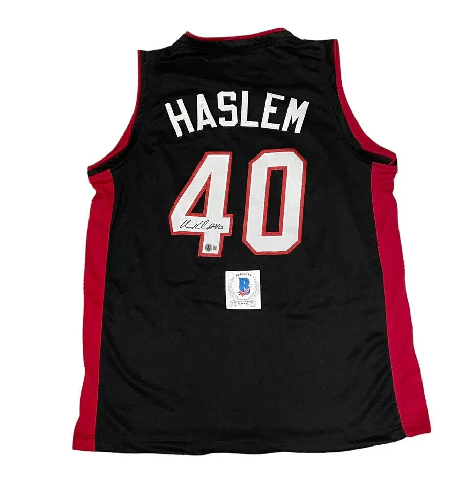 This autographed custom on-court style adult XL jersey has been personally hand-signed by Udonis Haslem of the Miami Heat.This autograph is certified by Beckett Authentication Services (BAS) Certification. It comes with the numbered authentication hologram with a QR code card that verifies the authentication on the Beckett Website.