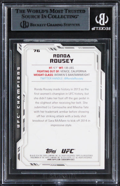 This Autographed 2014 Topps UFC Champions Silver #76 Card has been Personally Signed by Ronda Rousey of the Ultimate Fighting Championship. This item is 100% Authentic, it comes slabbed and authenticated by Beckett Authentication Services. The authenticity can be verified on Beckett Authentication Services website.