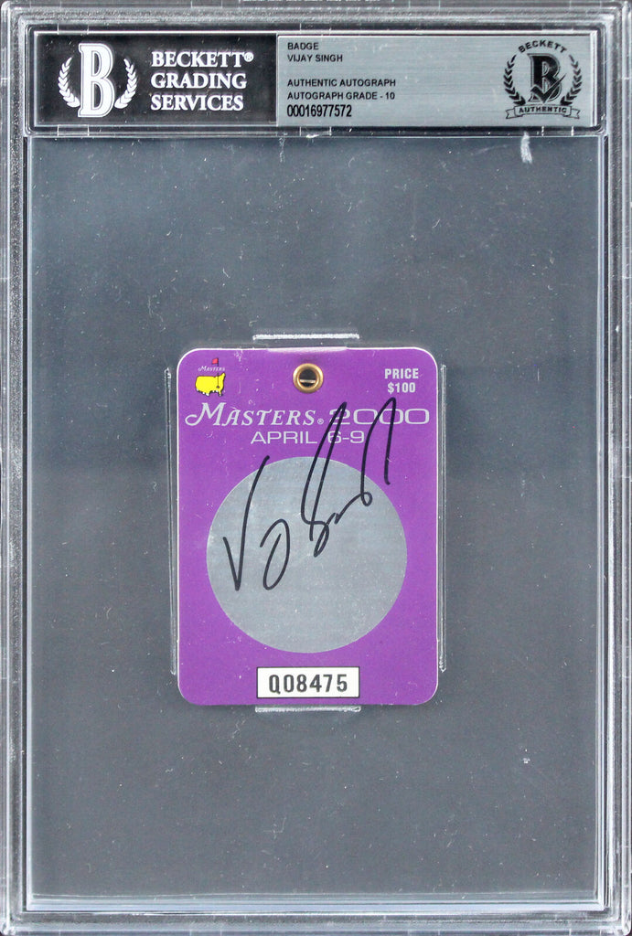 This Autographed Auto Graded Gem Mint 10! 2000 Masters Augusta National Golf Club Badge Ticket has been Personally Signed by Vijay Singh. This item is 100% Authentic, it comes slabbed and authenticated by Beckett Authentication Services. The authenticity can be verified on Beckett Authentication Services website. You will receive a ticket with the same inscription and a graded 10 autograph. The coloring of the ticket may vary, depending on the location on the seat. Please see the examples photographed, all are full tickets as photographed.
