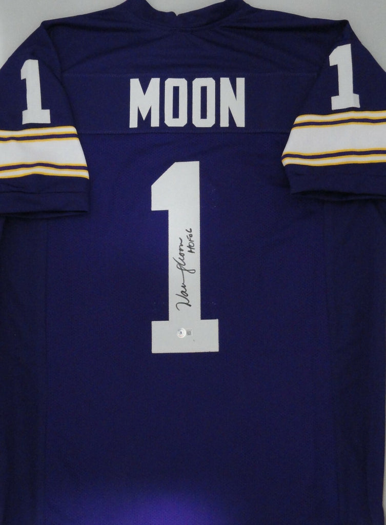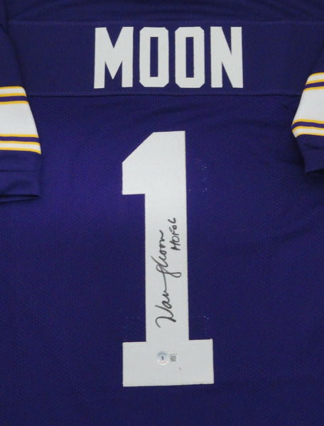 Custom Replica jersey hand signed by Minnesota Vikings Hall of Famer WARREN MOON. The signature is in Black Sharpie with the inscription "HOF '06". This jersey was signed at a private signing with us and would make a great addition to any OILERS collection! The jersey size is XL and all letters and numbers are sewn in. This autograph is guaranteed to be 100% authentic and will include a COA hologram from Beckett Authentication.