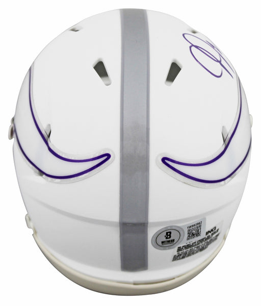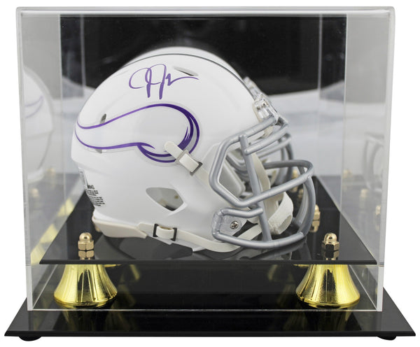 This Autographed 2024 On-Field Alternate Speed Mini Helmet W/ Uv Mirrored Back Acrylic Display Case has been Personally Signed by Justin Jefferson of the Minnesota Vikings. This item is 100% Authentic to include a hologram by Beckett Authentication Services. This item will come with an affixed Beckett Authentication Services (BAS) authentication sticker, which includes a scannable QR code to verify authenticity. Please note that Beckett no longer provides serial-numbered COA cards, and the attached BAS sticker will serve as the complete authentication for this item. This is a BAS Witnessed Protection Program item which means a Beckett Authentication Service representative was present when this item was being signed. We conducted an autograph signing with Justin Jefferson where multiples of the same item were signed. While the photographs are representative of this item, the size, placement and strength of the signature may vary. Each item is hand signed, therefore, each autograph is unique. This item can be verified through BAS Witnessed.