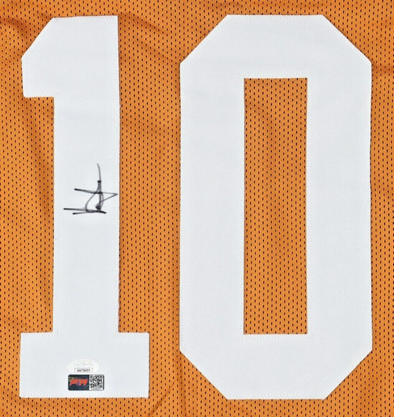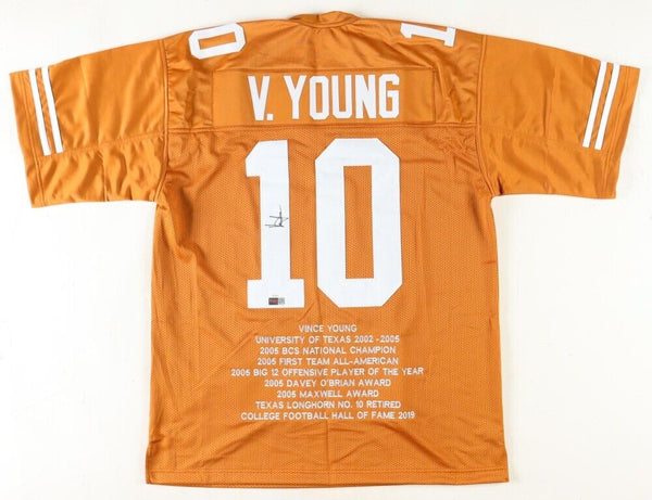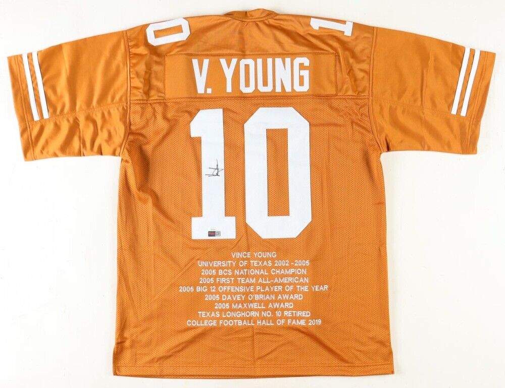 Custom on-field style jersey. Everything is sewn on, size XL. Hand-signed in black felt-tip pen by Vince Young. The lot / autograph(s) includes an official James Spence Authentication (JSA) hologram and QR Code Card for authenticity purposes. The signing of this item was witnessed by JSA.Authentication: JSA Hologram with QR Code Card