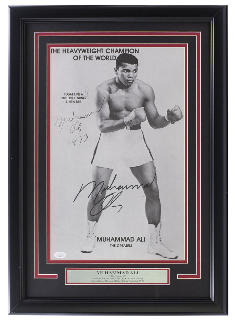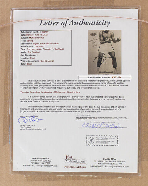 Featured is a Muhammad Ali signed framed 14x20 photo. This photo was hand signed by Muhammad Ali and authenticated by JSA authentication services. Included with the photo is a JSA hologram and certificate of authenticity. Brand new professional framing featuring double matting and an engraved nameplate. The frame measures approximately 25x22 in total size. The frame is ready for display. SPECIFICATIONS Autographed By: Muhammad Ali Team: Sport: Boxing Authentication: James Spence Authentication (JSA)