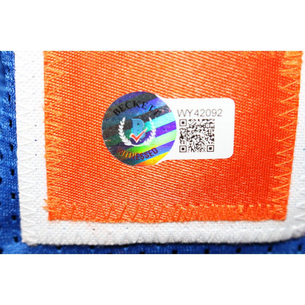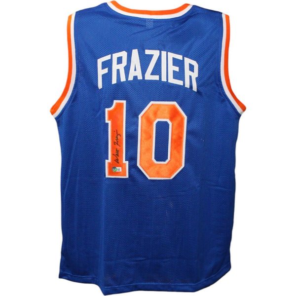Walt Frazier Autographed/Signed Pro Style Blue Jersey Beckett 43448 The number in the listing title is just an inventory sku for our records and is not the authentication number. The item pictured is a the exact item you will receive, please see photos for condition. This is a Pro Style Blue Jersey that was personally autographed by Walt Frazier. Includes a certificate of authenticity from Beckett Authentication Services (BAS) and Denver Autographs.