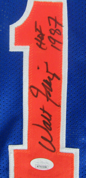 Custom on-court style jersey. Everything is sewn on, size XL. Has been hand-signed and inscribed by Walt Frazier (HOF).The lot / autograph(s) includes an official James Spence Authentication (JSA) hologram and matching COA for authenticity purposes. The signing of this item was witnessed by JSA. Also includes a proof picture from the signing.Authentication: JSA COA