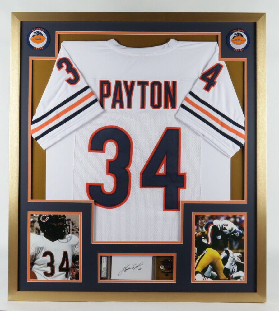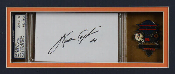 Autograph Graded PSA 10. Custom framed display measures approximately 34" x 38" in size and has been hand-signed by Walter Payton (D. 1999, HOF).The item / autograph(s) has been authenticated and encapsulated by PSA/DNA for authenticity purposes.Authentication: PSA Encapsulated