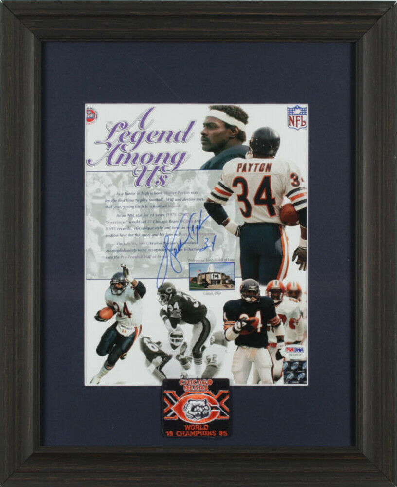 Walter Payton Signed Bears "A Legend Among Us" 13x16 Framed Photo Display With 1985 Super Bowl XX Patch (PSA Hologram)Custom frame measures approximately 13.25" x 16.25" in size and features a photo that has been hand-signed by Walter Payton (D. 1999, Chicago Bears, HOF). Display also includes a 1985 bears Super Bowl XX patch.The lot / autograph(s) includes an official PSA/DNA hologram for authenticity purposes.Authentication: PSA Hologram