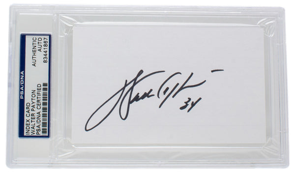 Featured is a Walter Payton Chicago Bears index card. This index card has been signed by Walter Payton and slabbed and authenticated by PSA/DNA authentication services. This item would make a great addition to any sports memorabilia collection.. SPECIFICATIONS Autographed By: Walter Payton Team: Chicago Bears Sport: Football Authentication: PSA/DNA Authentication Services