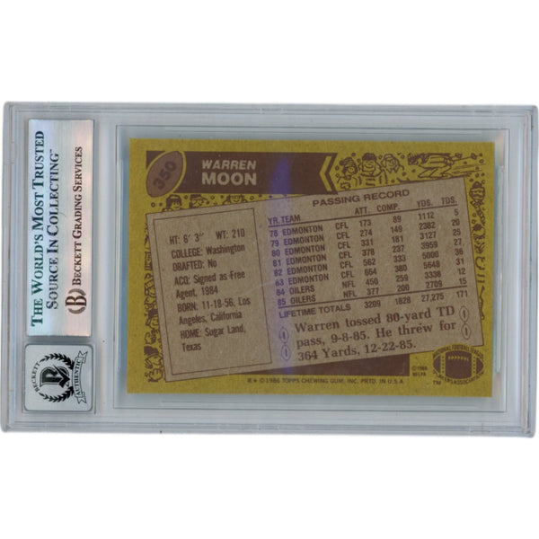 The number in the listing title is just an inventory sku for our records and is not the authentication number. The item pictured is the exact item you will receive, please see photos for condition. This is a Houston Oilers Slabbed 1986 Topps #350 Trading Card that was personally autographed by Warren Moon includes "HOF" inscription. Includes a certificate of authenticity from Beckett Authentication Services (BAS) and Denver Autographs.