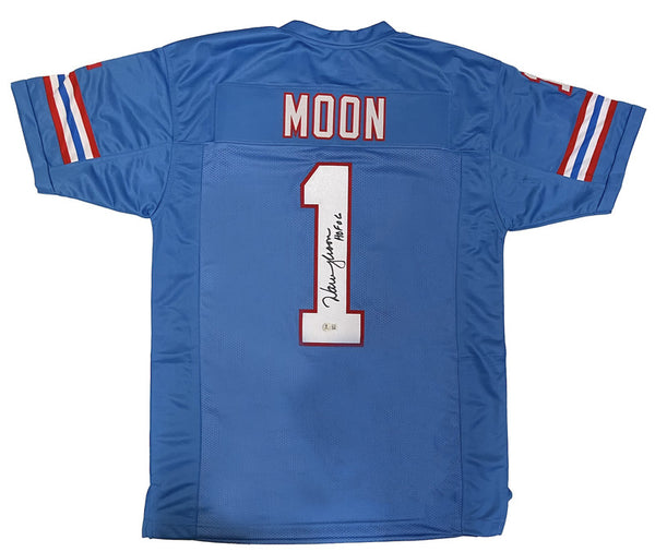 This custom blue jersey has been personally hand-signed by Warren Moon of the Houston Oilers. It comes with an individually numbered, tamper-evident hologram from Beckett Authentic. To ensure authenticity, the hologram can be reviewed online. This process helps to ensure that the product purchased is authentic and eliminates any possibility of duplication or fraud.