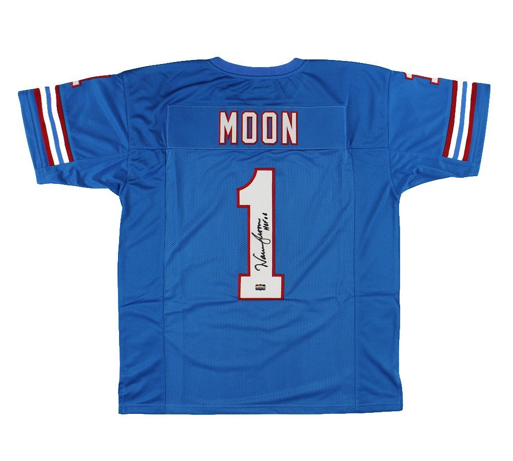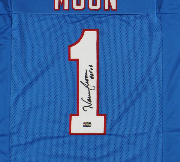 A Houston Custom Powder Blue Jersey hand signed by Warren Moon. The item and signature are in excellent condition. In addition to signing his name, Warren inscribed "HOF 06" on the item. Warren Moon is a former NFL Quarterback who spent most of his professional career with the Houston Oilers. Warren was the 1989 NFL Man of the Year, and in 2006 he was inducted into the Pro-Football Hall of Fame. AUTHENTICATION: The item has been tagged with a SmarTag powered by Prova Technology, which gives you digital access to the items authentication records, including a proof picture from the signing.