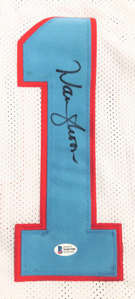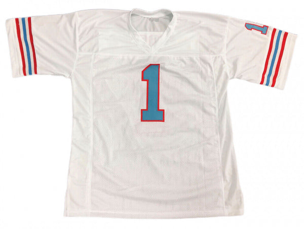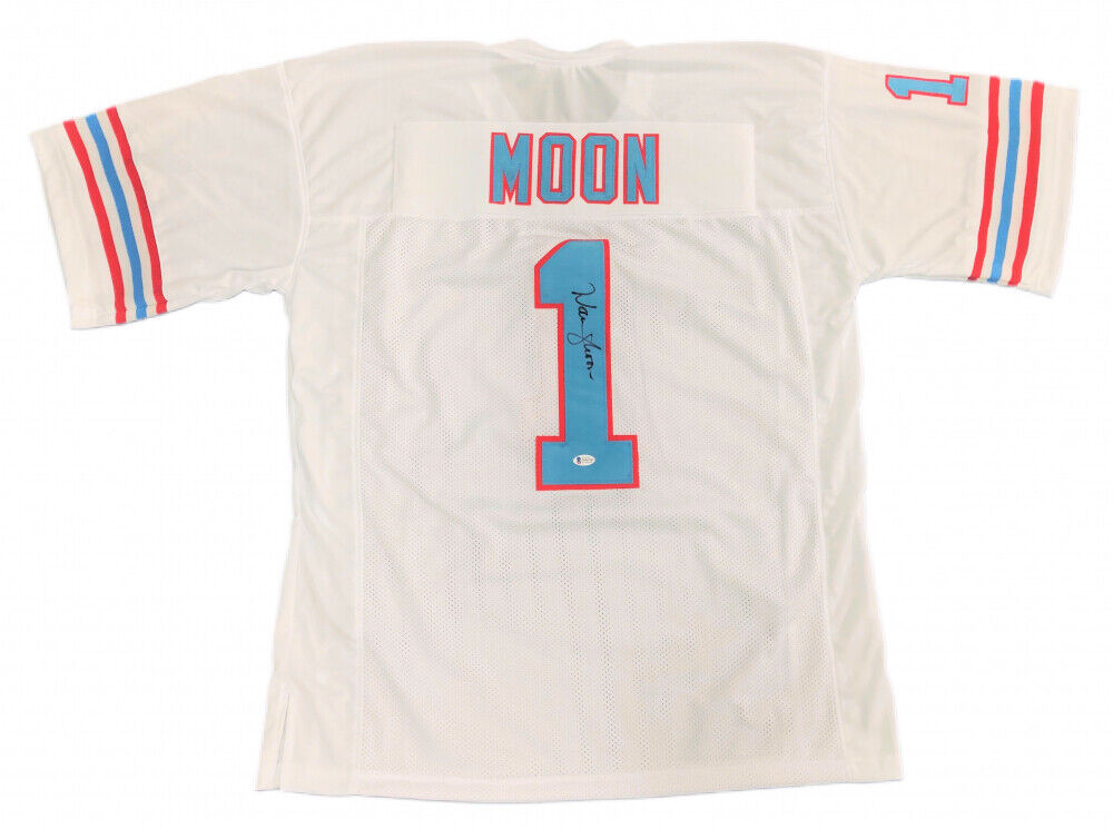 Custom on-field style jersey. Everything is sewn on, size XL. Has been hand-signed in black felt-tip pen by Warren Moon (HOF). The lot / autograph(s) includes an official Beckett Authentication Services serially-numbered hologram and matching COA for authenticity purposes. The signing of this item was witnessed by Beckett.Authentication: Beckett COA