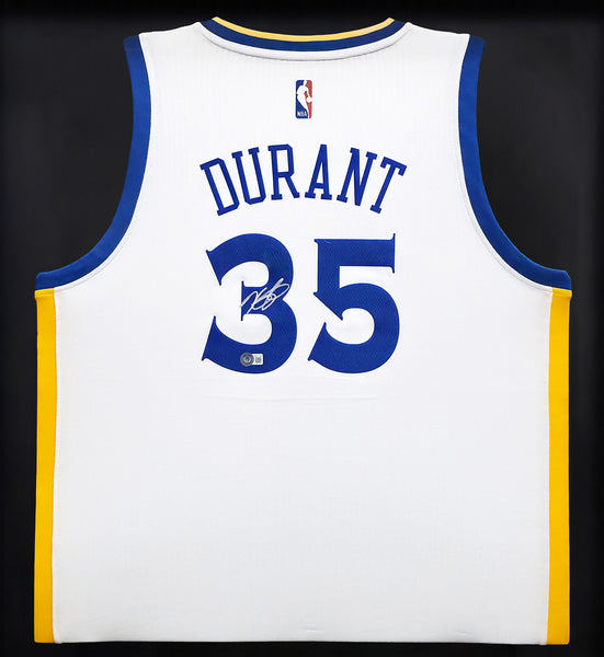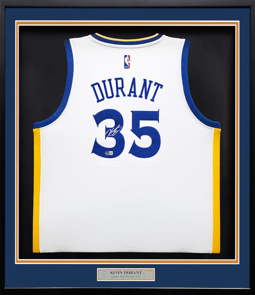 This is a framed White Adidas Golden State Warriors Swingman Jersey, approximately 31x36 with the frame, that has been hand signed by Kevin Durant. This item has been certified authentic by Beckett Authentication (BAS) and comes with their tamper-proof hologram.