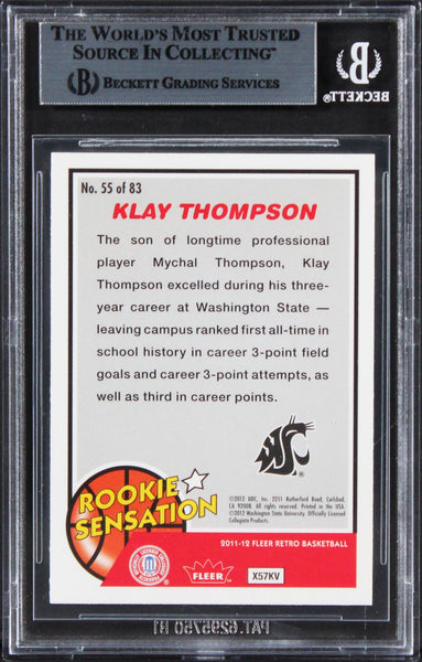 This Autographed 2011 Fleer Retro #55 Rookie Card has been Personally Signed by Klay Thompson of the Golden State Warriors. This item is 100% Authentic, it comes slabbed and authenticated by Beckett Authentication Services. We have multiples of this same item. While the photographs are representative of this item, the size, placement and strength of the signature may vary. Each item is hand signed, therefore, each autograph is unique.