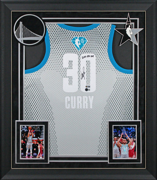 This Autographed White 75th Anniversary All Star Game Nike Framed Jersey with the inscription of "2022 ASG MVP" has been Personally Signed by Stephen Curry of the Golden State Warriors. This item is 100% Authentic to include a hologram by Beckett Authentication Services. This item will come with an affixed Beckett Authentication Services (BAS) authentication sticker, which includes a scannable QR code to verify authenticity. Please note that Beckett no longer provides serial-numbered COA cards, and the attached BAS sticker will serve as the complete authentication for this item. We have multiples of this same item. While the photographs are representative of this item, the size, placement and strength of the signature may vary. Each item is hand signed, therefore, each autograph is unique. This item has been professionally framed to overall dimensions of approximately 32 x 37 inches. Multiple sizes available. Reach out for availability. This jersey will be framed to order, it will take 3-4 days from purchase date for it to ship.