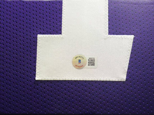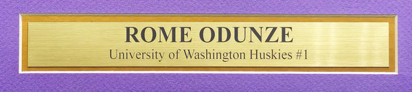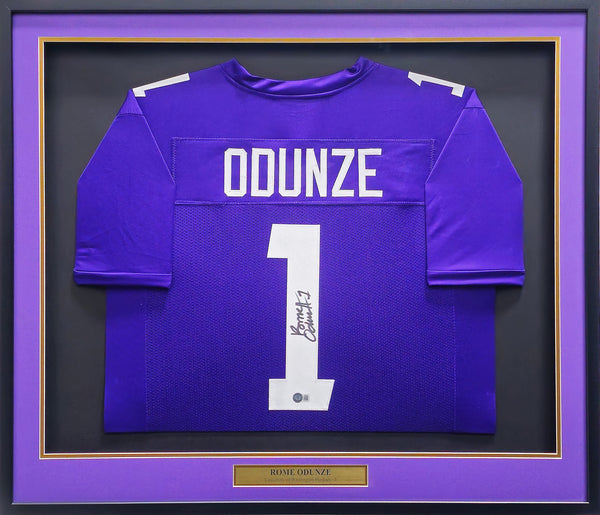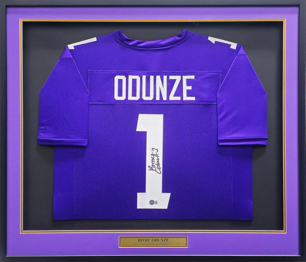 This is a framed Purple Jersey, approximately 31x36 with the frame, that has been hand signed by Rome Odunze. This item has been witnessed and certified authentic by Beckett Authentication (BAS) and comes with their tamper-proof witness hologram.