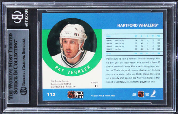 This Autographed 1990 Pro Set #112 Card has been Personally Signed by Pat Verbeek of the Hartford Whalers. This item is 100% Authentic, it comes slabbed and authenticated by Beckett Authentication Services. The authenticity can be verified on Beckett Authentication Services website.