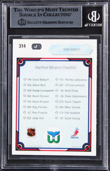 This Autographed 1990 Upper Deck #314 Card has been Personally Signed by Ron Francis of the Hartford Whalers. This item is 100% Authentic, it comes slabbed and authenticated by Beckett Authentication Services. The authenticity can be verified on Beckett Authentication Services website.
