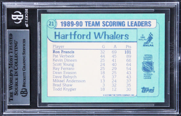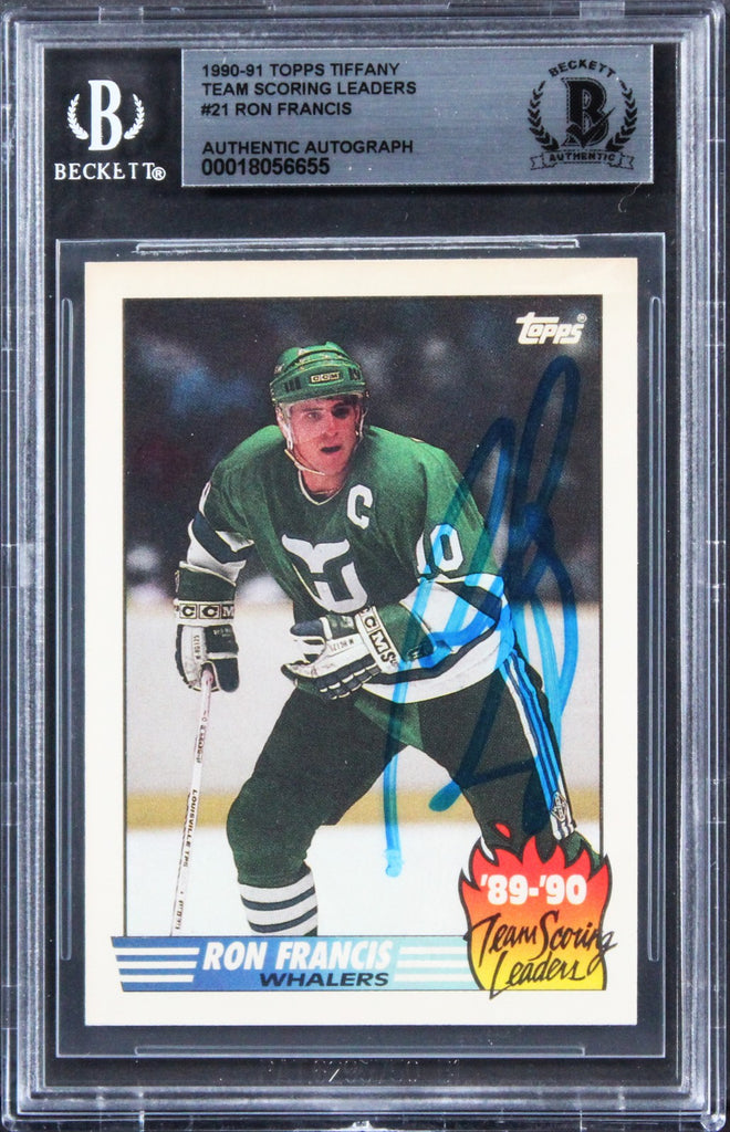 This Autographed 1990 Topps Tiffany Team Scoring Leaders #21 Card has been Personally Signed by Ron Francis of the Hartford Whalers. This item is 100% Authentic, it comes slabbed and authenticated by Beckett Authentication Services. The authenticity can be verified on Beckett Authentication Services website.